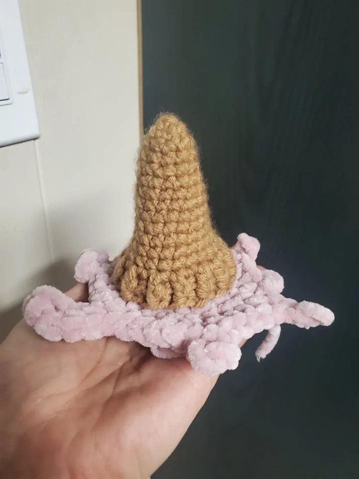 When finished this guy is finished, he should be 5 inches x 5 inches wide and 8 inches tall (including icecream cone) however, if you used chunkier yarn and larger hook, it may come out bigger and vice versa. Also, you will want to take into account the cone, if you are using chunkier yarn, you make need to double strand your cone.