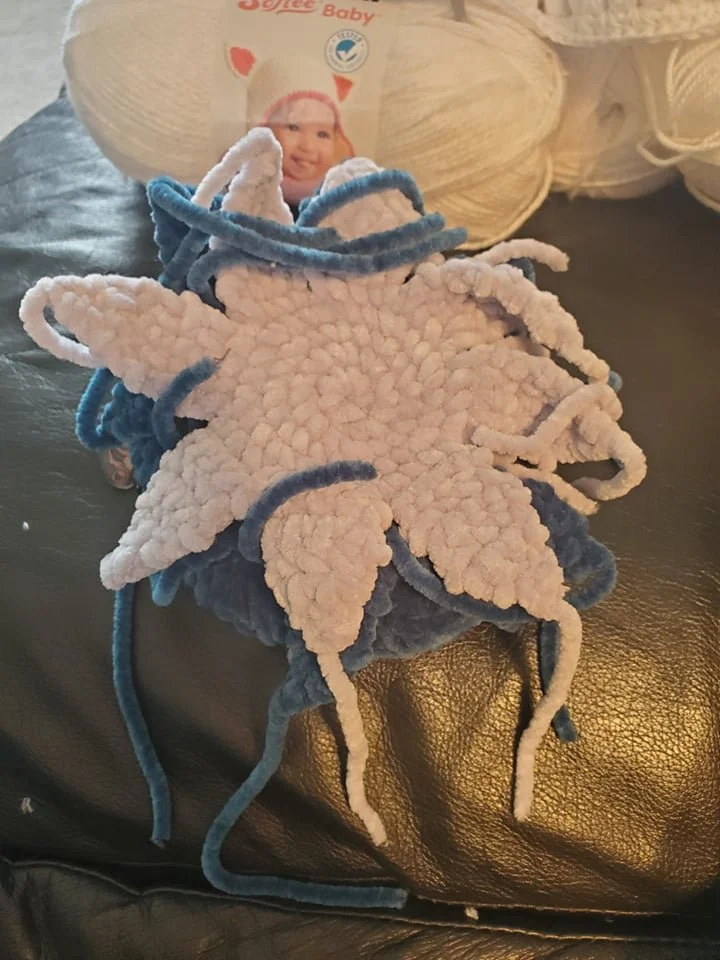 Yarn: Any chunky yarn will do. I used Premier Parfait Chunky. And I used a worsted weight for the cone. I used 4 colours. I used approx. 175 yards for the main colour, 50 for the bottom tentacles, 25 for the melted ice cream and 25 for the cone.